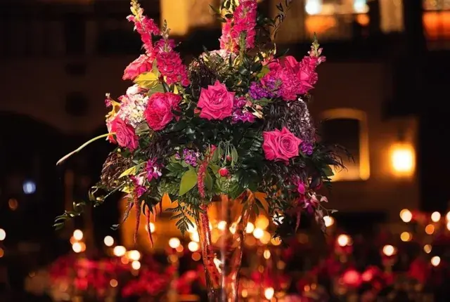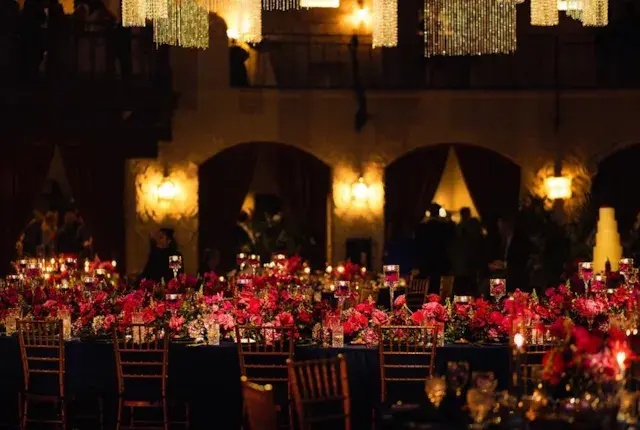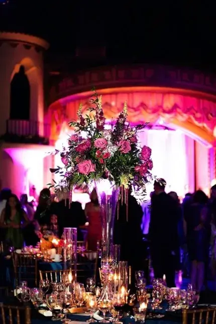 As the sun began to set, guests were invited to take their seats for dinner. As they found their tables, it was impossible not to miss the impeccable attention to detail. The centerpieces were a visual delight, consisting of aromatic pink florals and candles of varying heights. They added a touch of romance and sophistication to the dining experience, creating an atmosphere that was both enchanting and inviting.