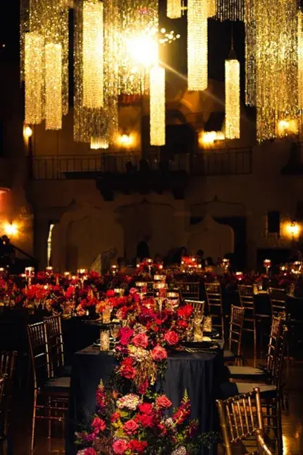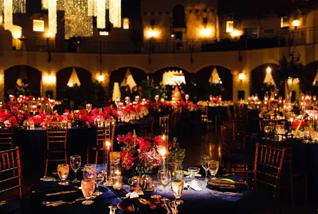 Guests dined on specialty black matte dinnerware, with each place setting featuring a magnolia leaf scripted with the guest's name, adding a personal touch to the evening. The guest dinner tables were a vision of opulence, dressed in alternating marine velvet, navy Italian crush, and Nile blue satin linens. The accompanying black satin napkins were elegantly folded in a vertical pleated band, creating a striking contrast. Gold chivari chairs with navy cushions provided comfortable and regal seating.