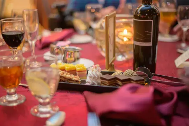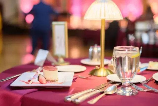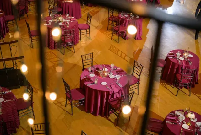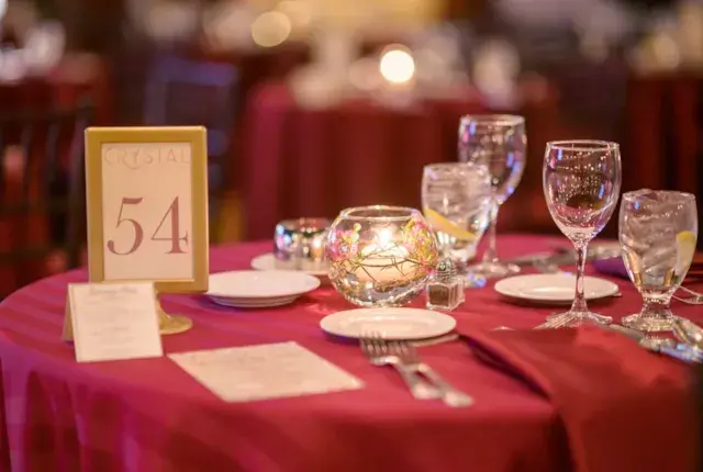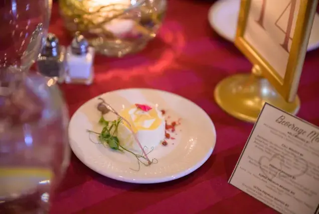 Upon arrival, guests were greeted with butler-passed hors d'oeuvres of Brie with Raspberry Preserve Tartlets and Mini Beef Wellingtons, courtesy of Crystal Signature Events catering. And who needs a bouquet of flowers to celebrate this day devoted to love when you could instead enjoy the signature cocktail, “The Sweetheart” which was garnished with a hibiscus flower and boasted floral flavors of elderflower and rose. As guests were seated for dinner, all admired the alternating burgundy and merlot-colored linens and mahogany Chiavari chairs. Not a detail was missed, from the floating candles and floral centerpieces down to the individual rose-shaped butters.