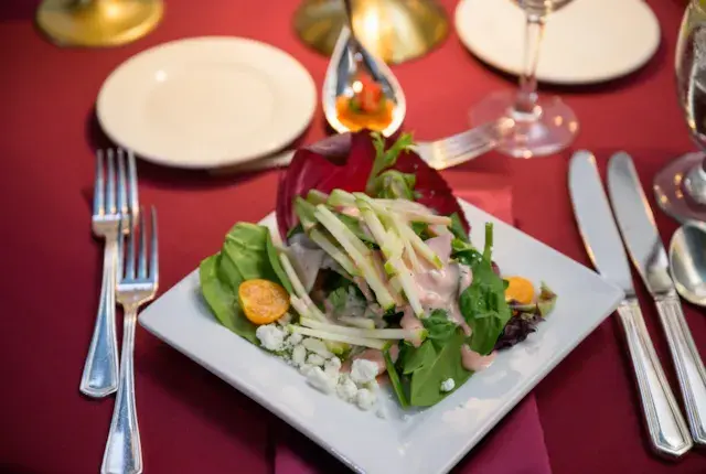 The Indiana Roof’s signature thunderstorm sound and light show kicked off dinner service and after a brief welcome, a synchronized server parade brought out the salad course. From the sight of the Amuse Bouche of Polenta with Arugula Pesto served on a spoon, to the smell of the duo-plated entree of Chicken en Phyllo with Spinach and Feta and Medallions of Beef Tenderloin, to the taste of the creamy New York Style Cheesecake with Strawberry Coulis Ribbon, Chef created a 4-course menu that delighted every sense and fulfilled every craving.